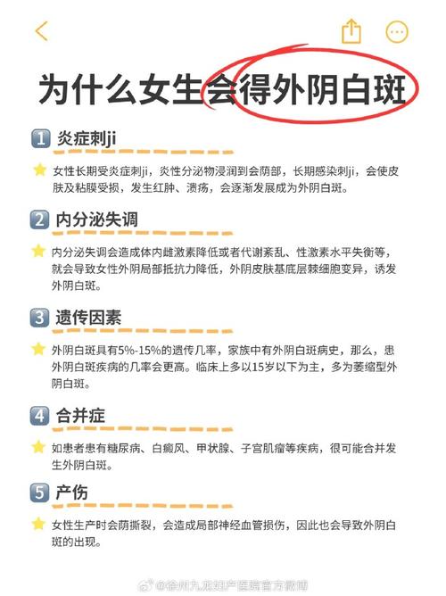 外阴白斑是一种慢性的外阴皮肤病,它可能导致皮肤和黏膜的变白干燥和瘙痒虽然外阴白斑本身通常不是一种严重的疾病,但如果不加以治疗,可能会给患者的生活质量带来负面影响,并可能导致并发症,如皮肤裂开感染或癌变因此,及时诊断和治疗非常重要外阴白斑的确切原因尚不完全清楚,但可能与遗传自身免疫问题局部刺激。